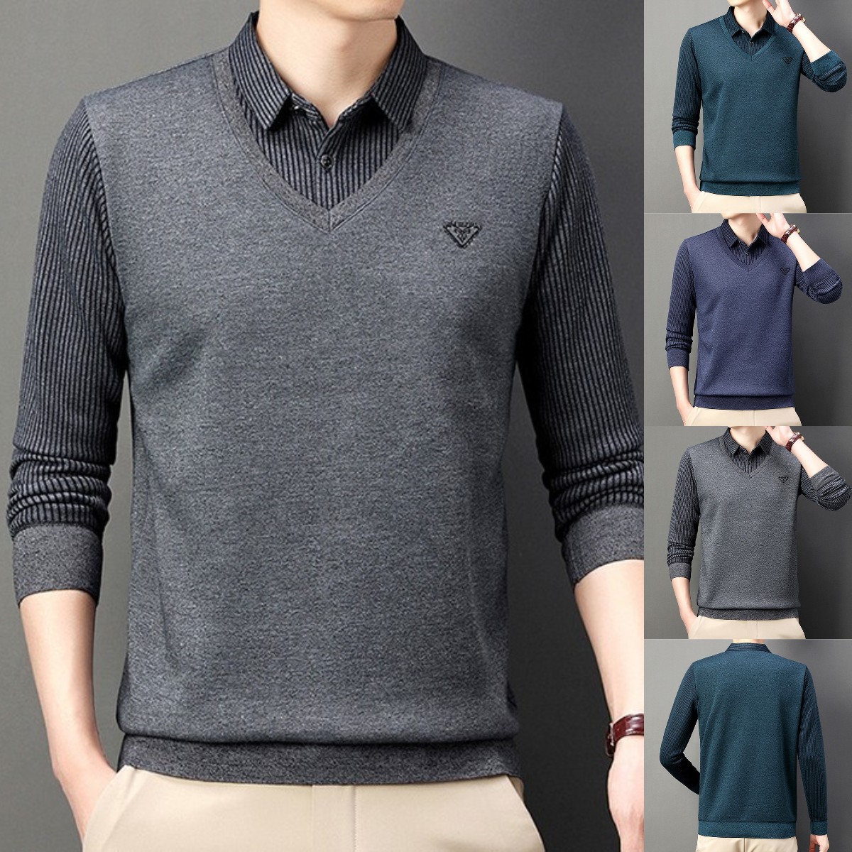 💥🔥【M-4XL】Есенно-зимна мъжка поло тениска с яка и дълъг ръкав Мъжка поло тениска от две части за средна възраст и възрастни