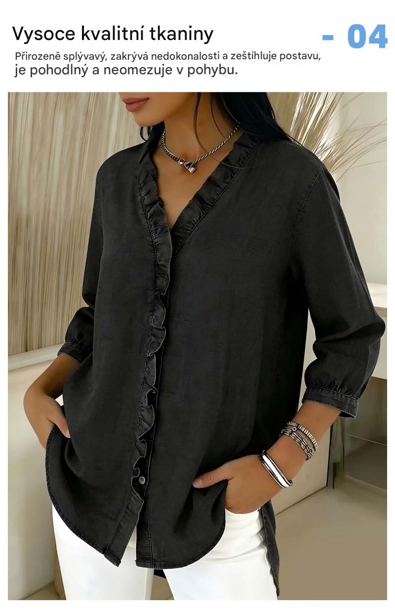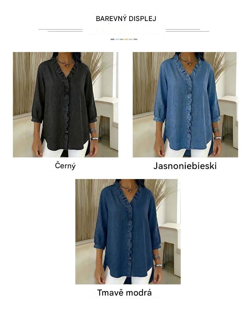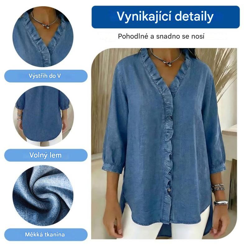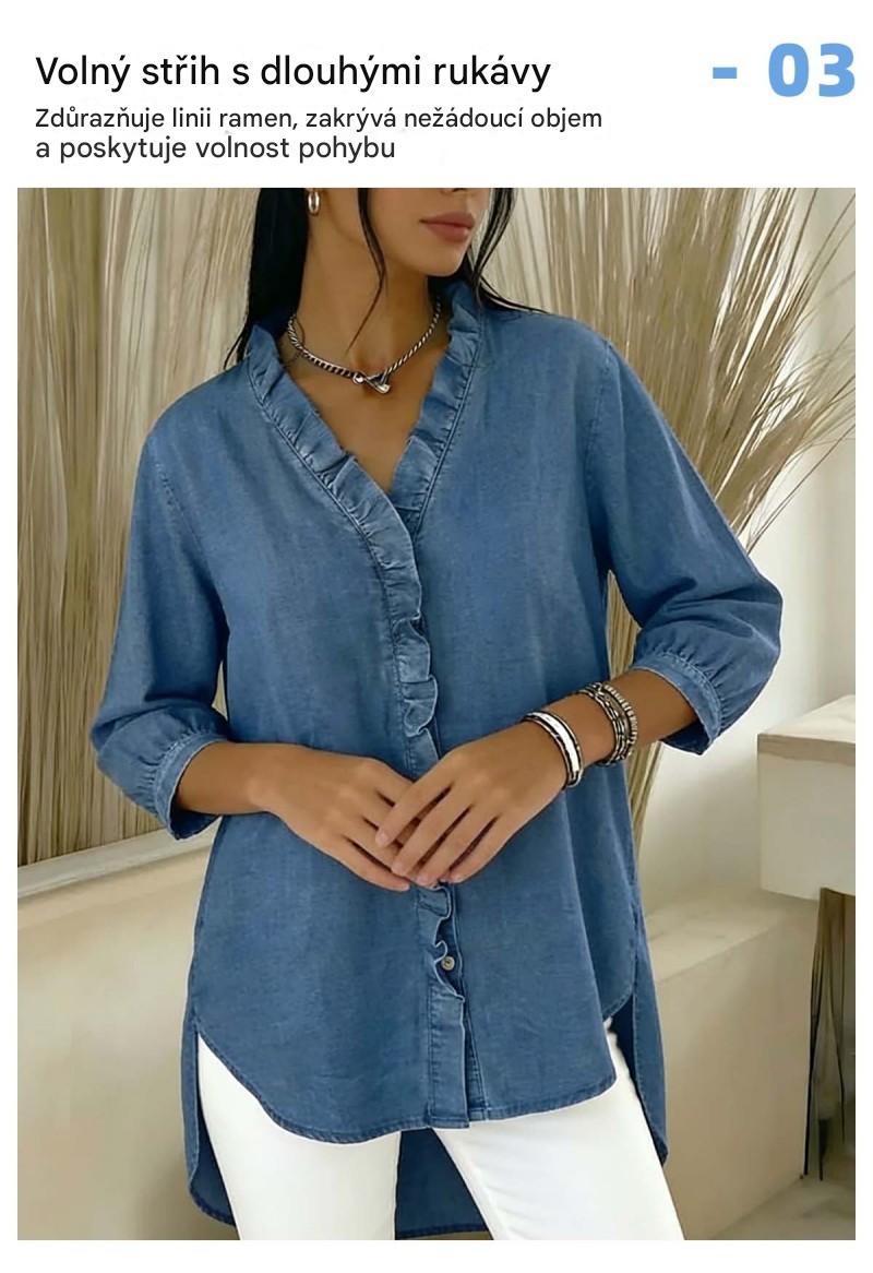 【S-3XL】Dámská ležérní džínová košile s výstřihem do V a volánky