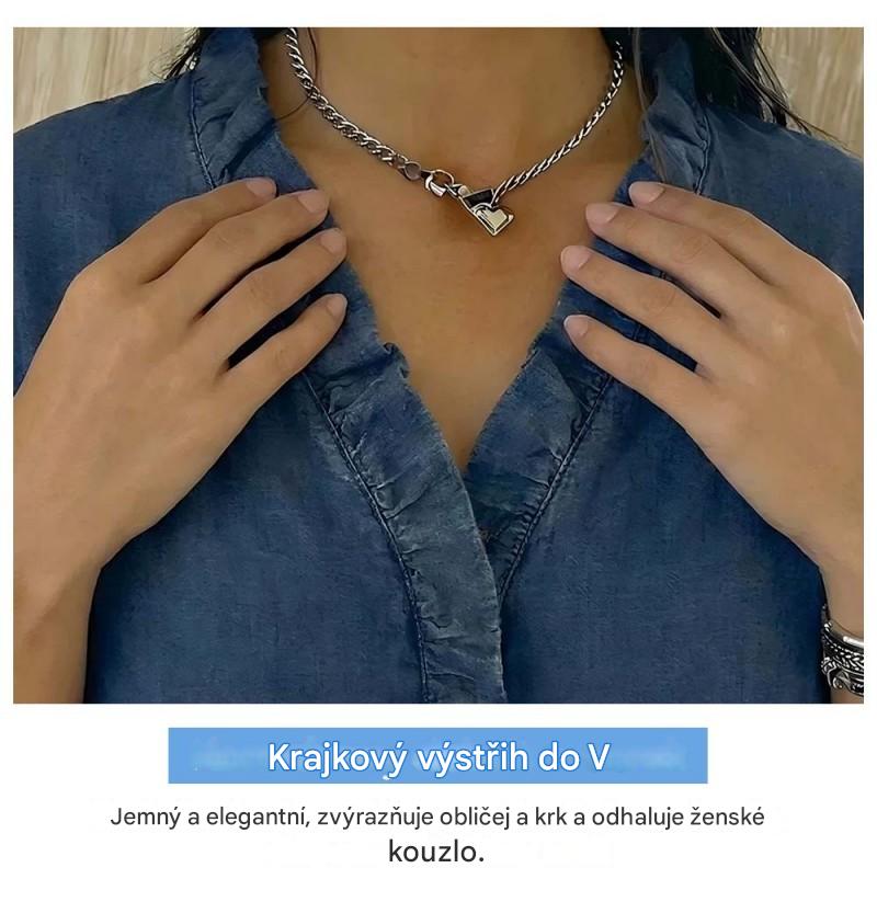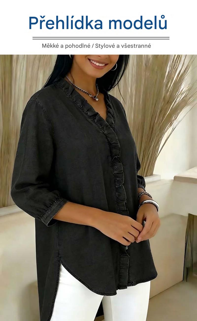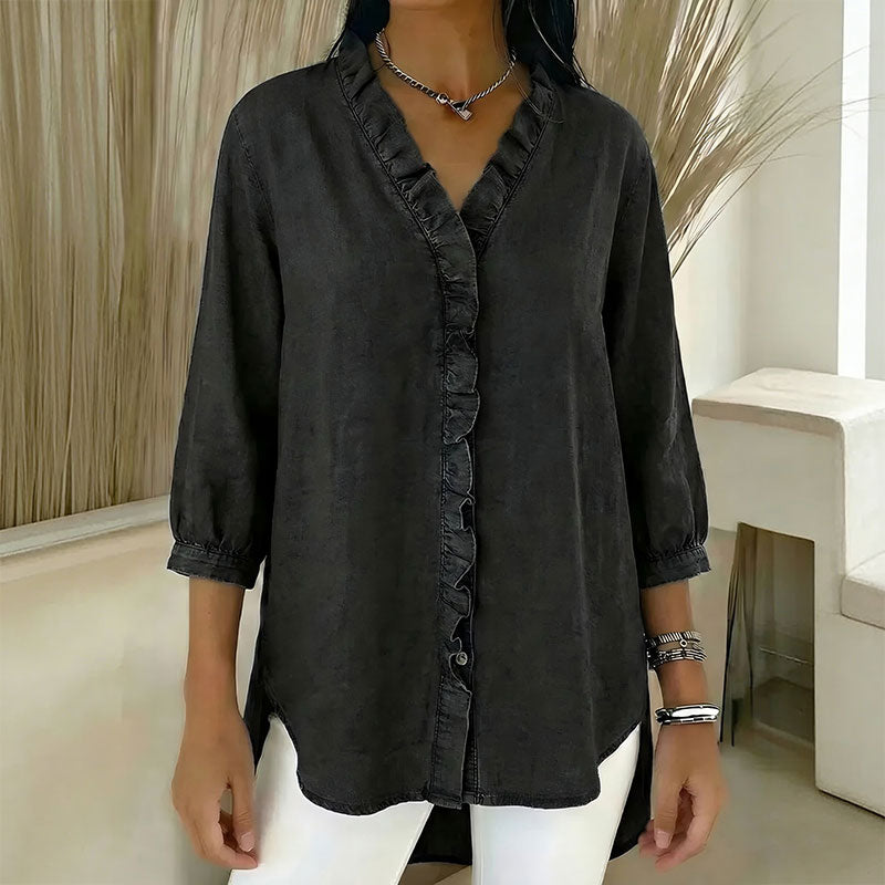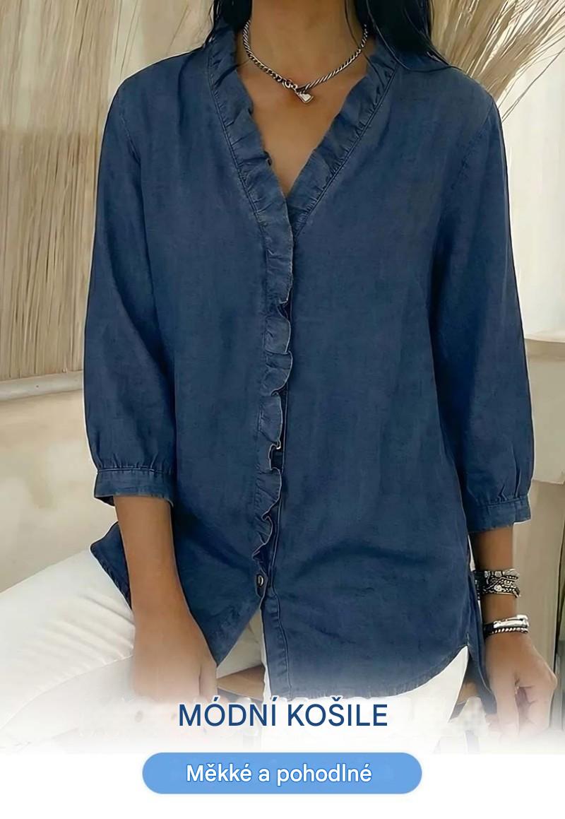 【S-3XL】Dámská ležérní džínová košile s výstřihem do V a volánky