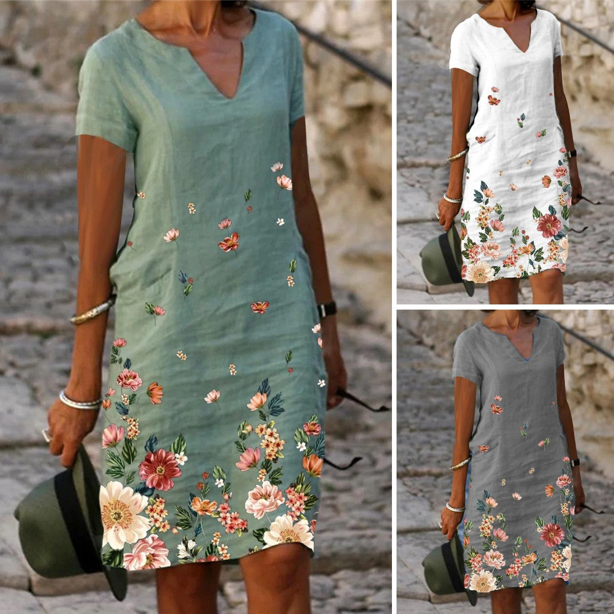 🌺【S-3XL】 Letnia bawełniana i lniana prosta sukienka z dekoltem w serek, krótkimi rękawami z nadrukiem motyli i kwiatów