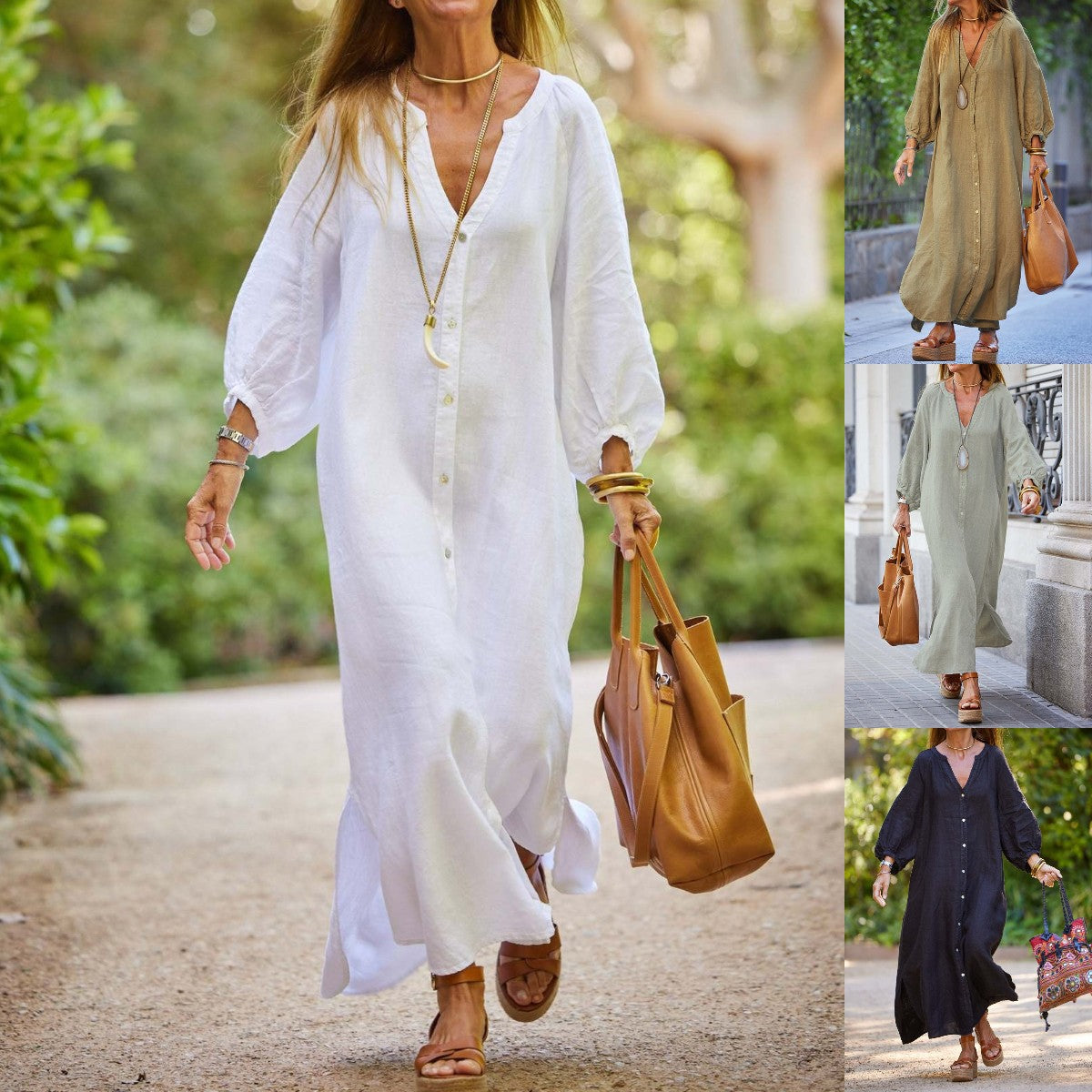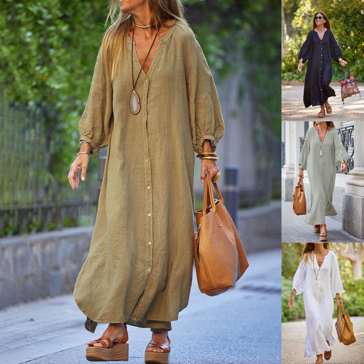 👚💃【50% zniżki 🔥】【S–3XL】👗 Długa sukienka koszulowa damska z dekoltem w serek, bawełna i len, duże rozmiary