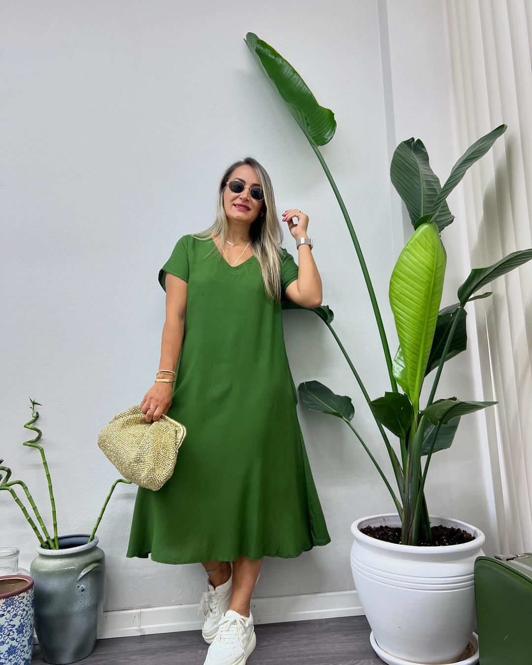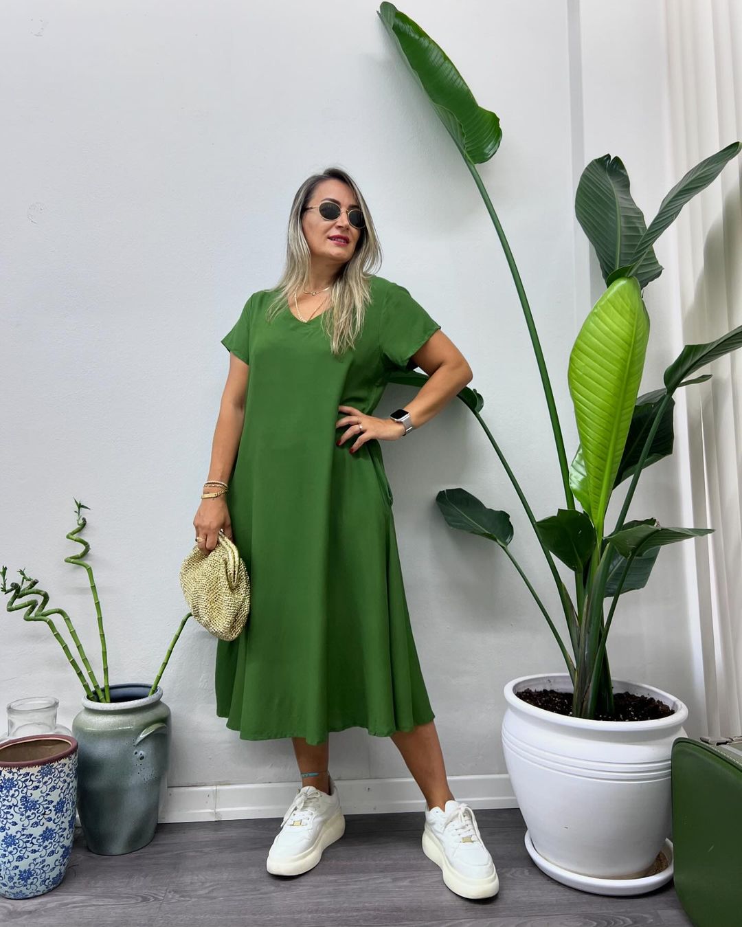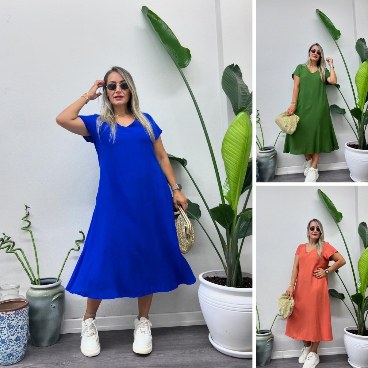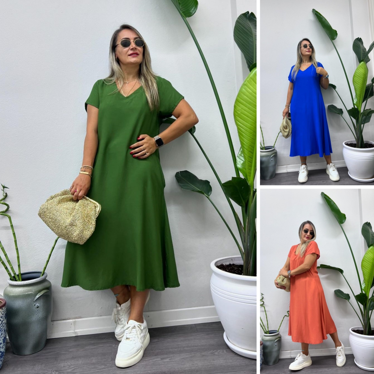 🔥✅Długa jednokolorowa sukienka z dekoltem w kształcie litery V, wykonana z czystej bawełny3731914