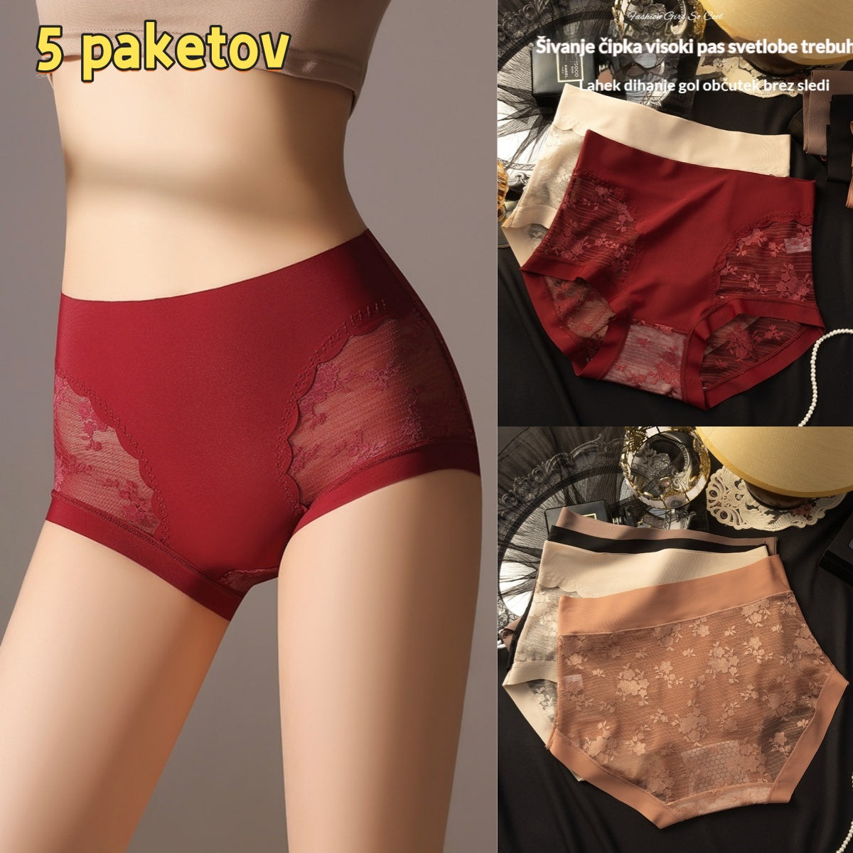 š„[5-delni komplet] Ženske visoko elastiÄne brezÅ”ivne Äipkaste hlaÄke s funkcijo za nadzor trebuha in dvig zadnjice